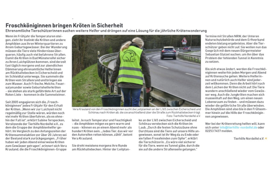 Im vergangenen Sommer haben wir erneut Kontakt zu UNB, Biostation und Straßen NRW aufgenommen, um die Situation zu verbessern. Der feste Zaun müsste verlängert/ verändert werden, Durchlässe unter der Straße sollten dadurch zugänglich gemacht werden und es müssen mehr Gewässer geschaffen werden. Denn es hat sich in den vergangenen Jahren gezeigt, dass die bisherige Maßnahme unzureichend ist. Immer noch werden zuviele überfahren, der Ehrenamtseinsatz ist unverändert zu hoch, und die Tiere umwandern die Leiteinrichtung großräumig, so dass das Problem verlagert wird. Diesbezügl. fanden in den letzten Monaten Gespräche und Ortstermine statt.
