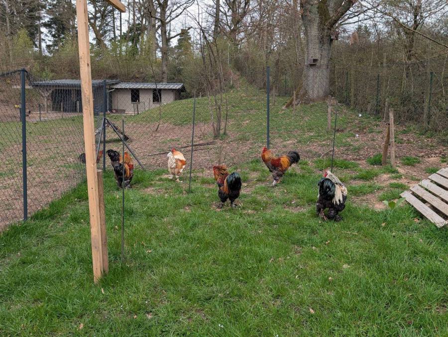 Gleich Sechs Brahma Hähne wurden ausgesetzt, konnten durch beherzte Anwohner gefangen und erstmal untergebracht werden. Durch unsere Bemühungen wurden Kontakte zu "Rettet das Huhn" hergestellt und die Truppe durfte zum Gnadenhof "Balus Arche Liebenswert" ins Saarland vermittelt werden. Die Jungs hatten Glück im Unglück.